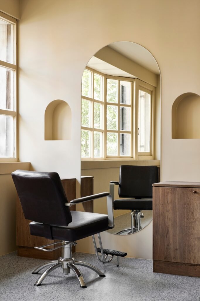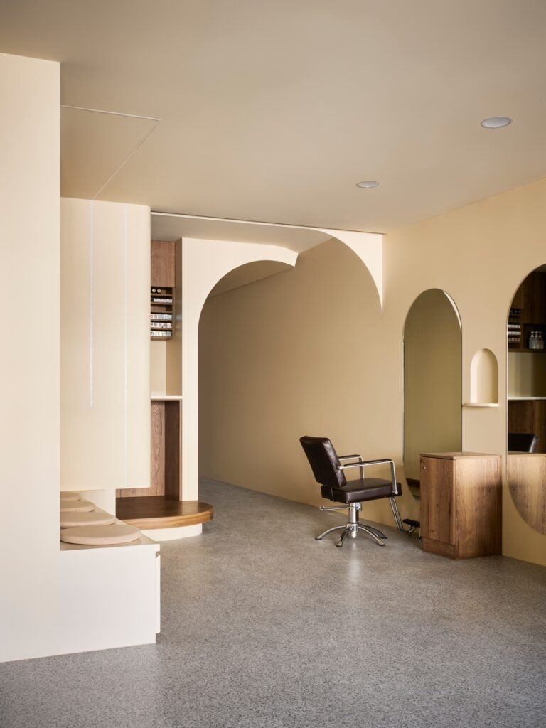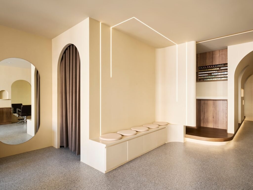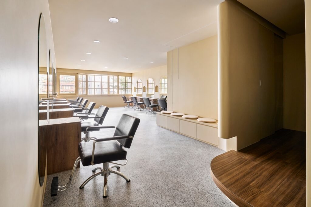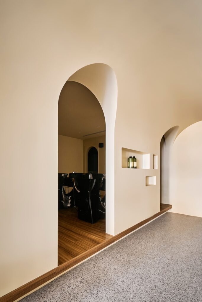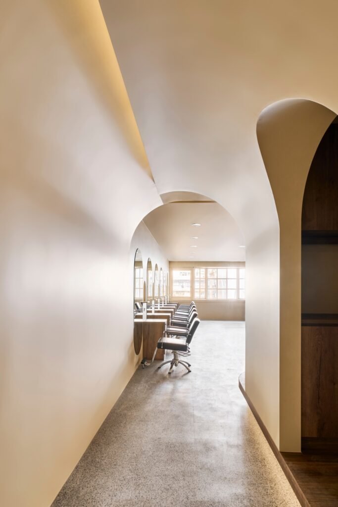 弧形曲面是此處的亮點,彎曲的壁面自然銜接至天花板,構築出宛如洞穴般的包覆氛圍,為長時間美髮過程帶來信賴與安全感。地坪的木紋元素與水磨石和諧共融,質感交錯卻不衝突。