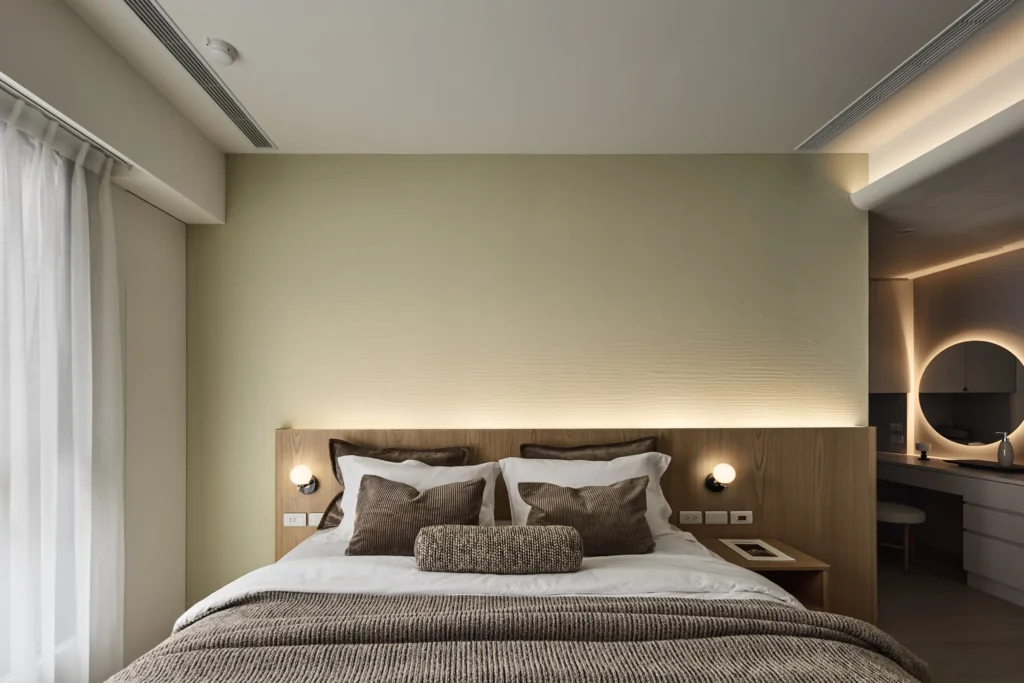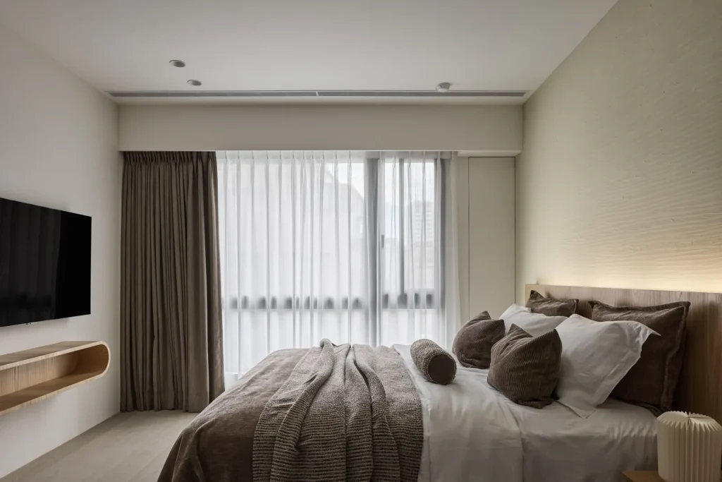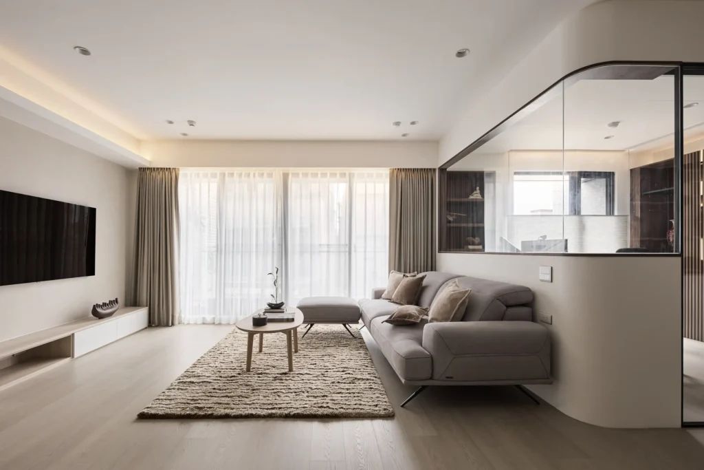 材質選擇以白與淺木為基底,搭配灰色沙發與溫潤木質家具,層次柔和,細節耐看,隨時間愈發耐人尋味。