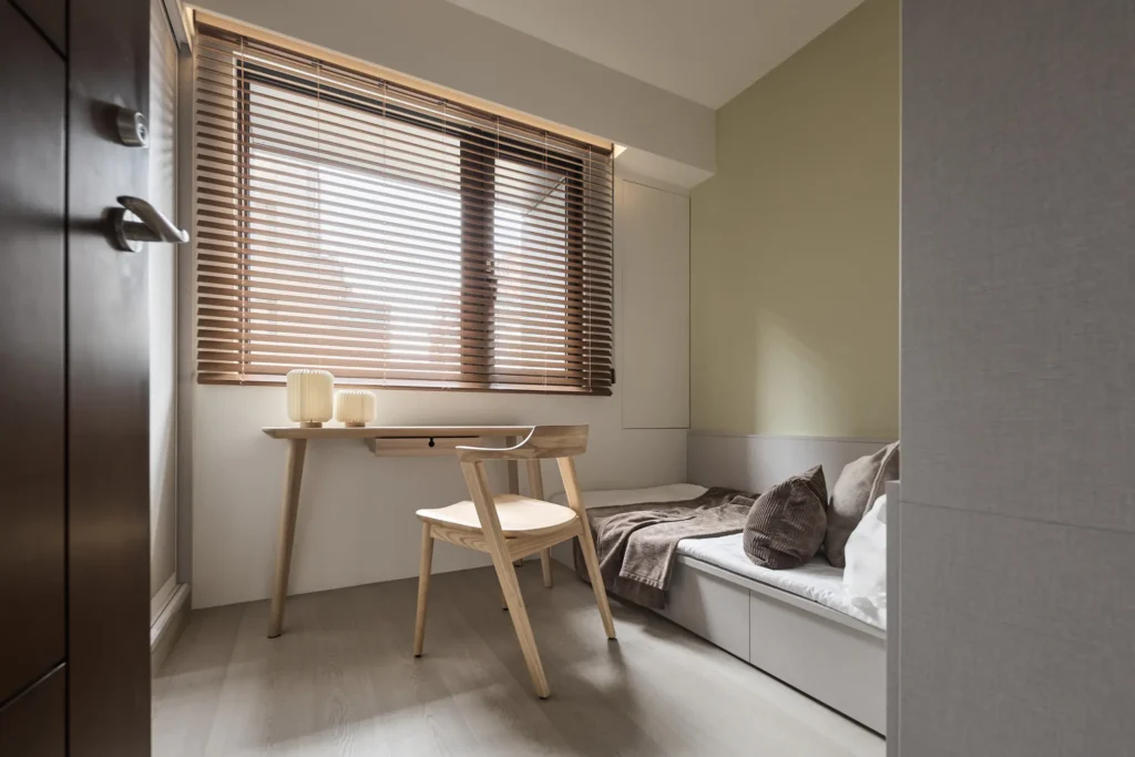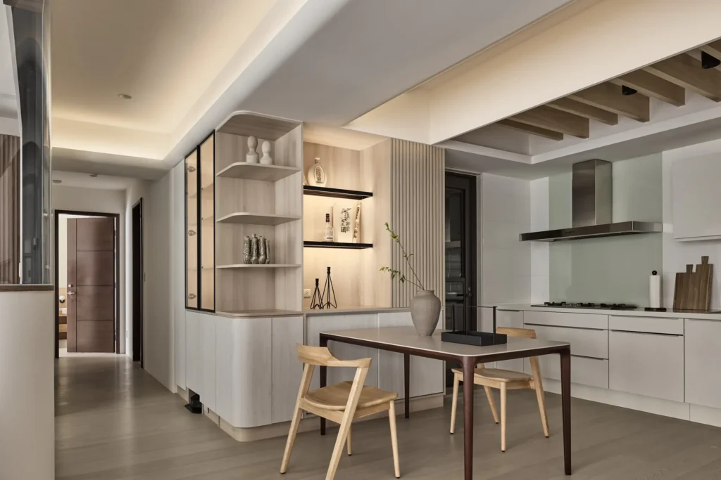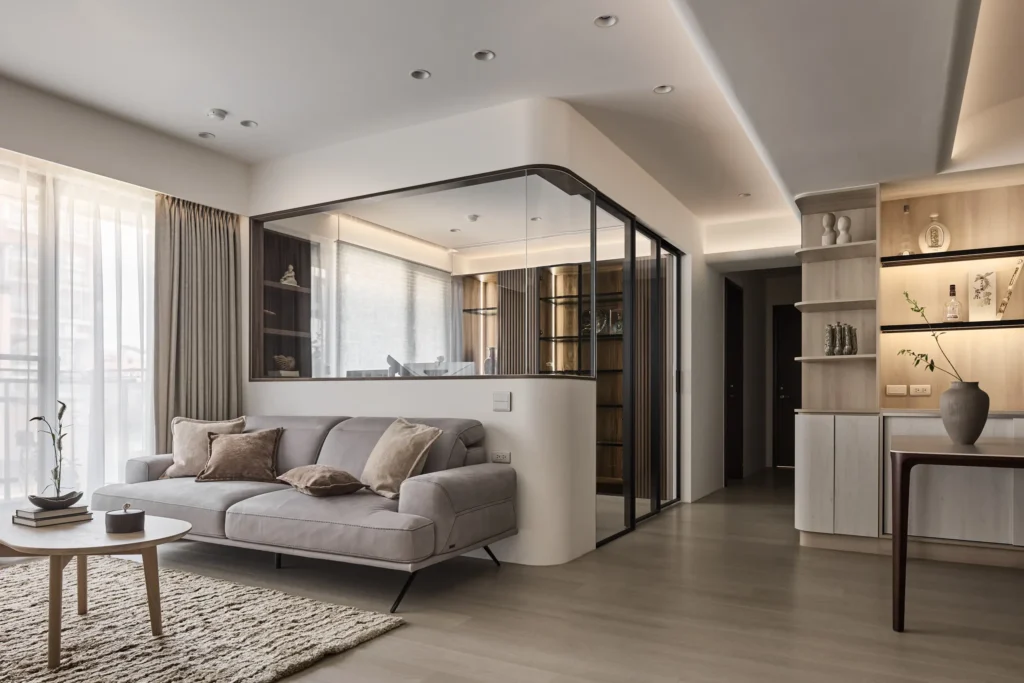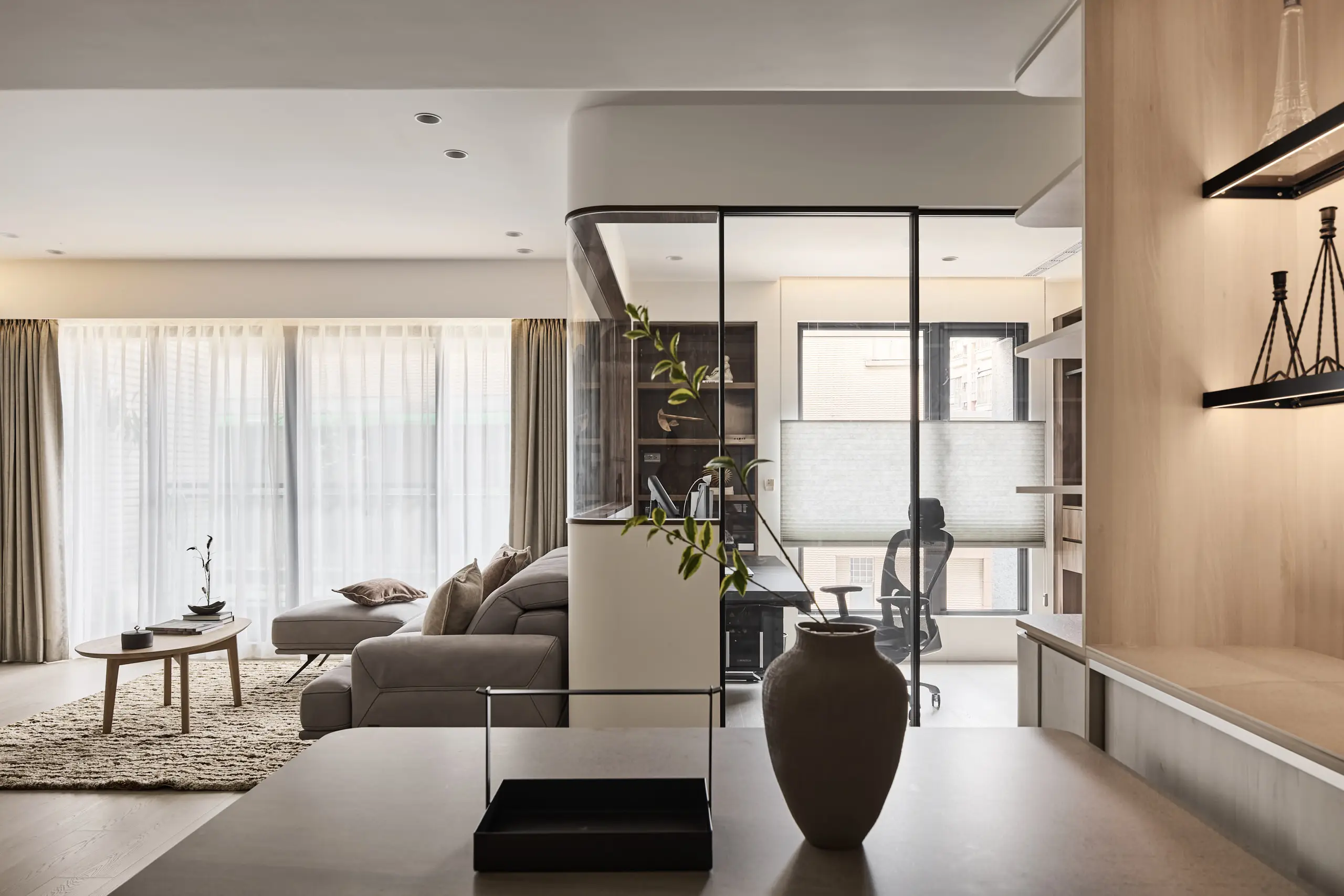 客廳、餐廳與廚房以開放式格局自然串聯,動線流暢而不張揚,讓家人之間的互動在日常中自在發生;書房則以玻璃隔間界定空間邊界,保留視線穿透與光線流動,也讓陪伴不被隔絕。