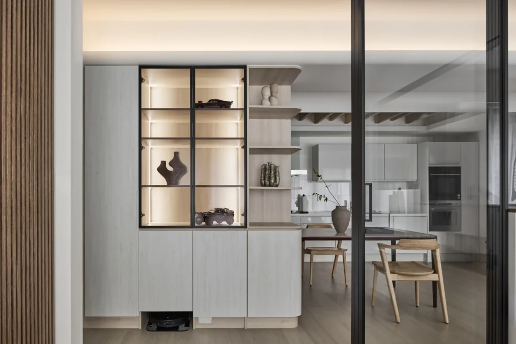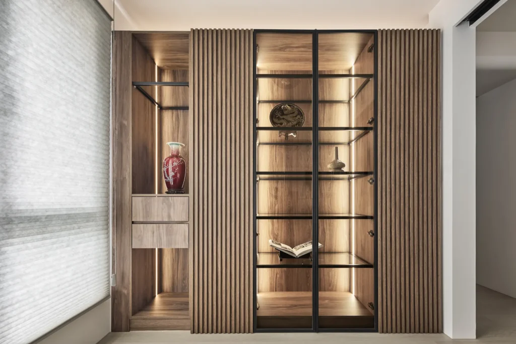 廳側邊的展示與收納櫃,是功能與情感的交會點。