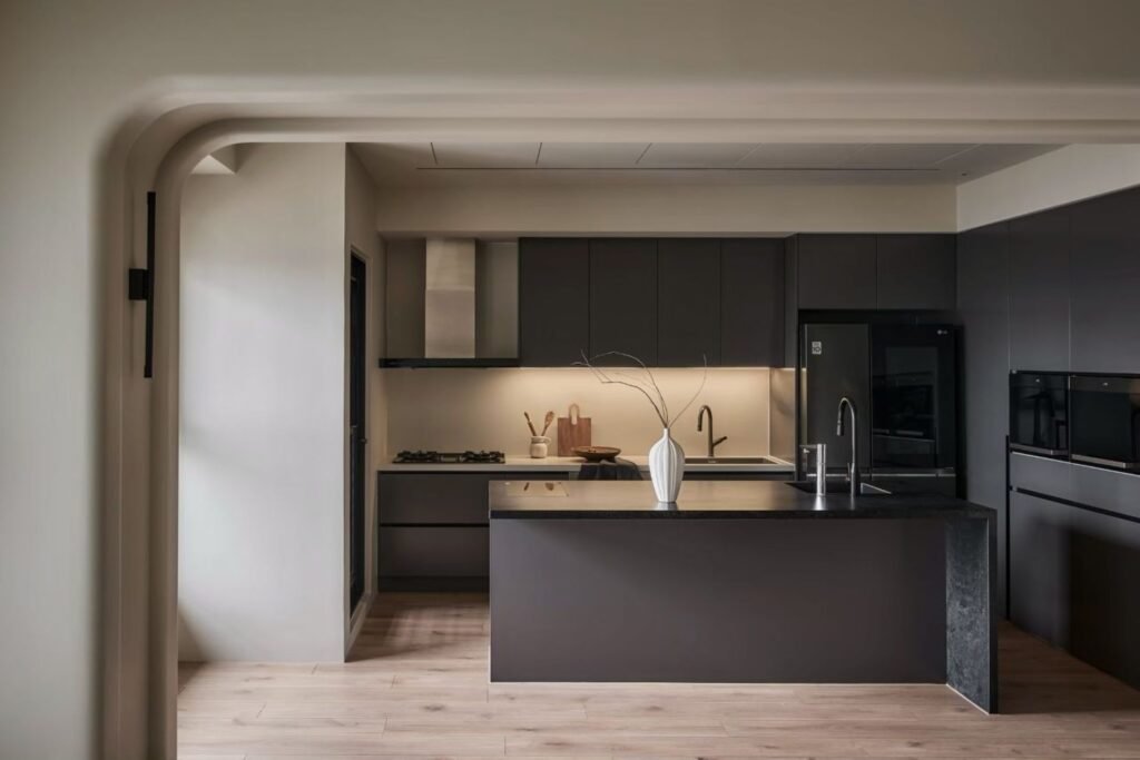 純淨的淺色調與圓潤線條勾勒著空間,設計師將業主對親子生活的願景轉化為細膩的空間語彙。本案巧妙運用開放式格局,讓家的溫度自然流動。量身訂製的中島檯面成為親子共創美味的歡樂舞台,而融入起居空間的臥榻區則是共享閱讀時光的溫暖角落。每個設計細節都傳遞著對孩子的關懷,讓這個家不只是遠離都市喧囂的庇護所,更是見證親子溫馨時刻的環境。