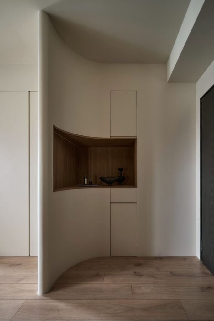 整體空間以淺色調和奶油色系為主軸,搭配溫潤感受的木紋元素,營造出柔和的居家氛圍。玄關的圓弧牆面與餐廳的拱門設計,不僅減少碰撞的風險,還創造了流暢的空間動線。中島區域選用耐刮材質,打造無憂的烹飪空間,而臥榻區則成為全家人共享閱讀時光的溫馨角落。