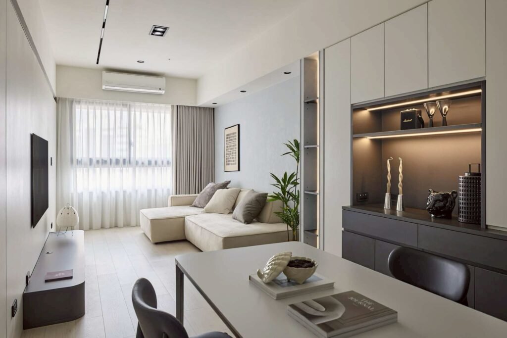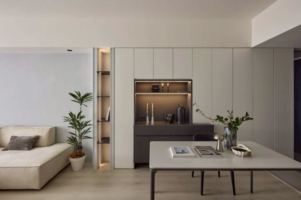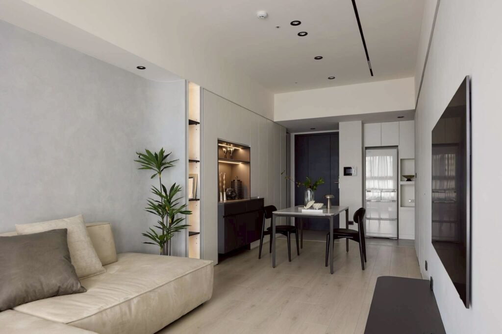 極簡線條搭配柔和光感,白牆與隱藏收納讓視覺清爽,客餐廳一體化設計兼顧美感與實用。