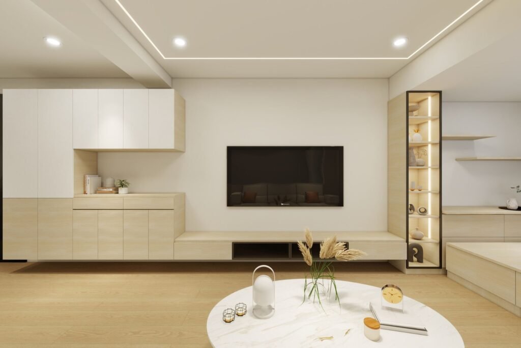 設計以懸浮電視櫃為特色,不僅便於清潔,還能避免撞傷,節省空間並提升視覺輕盈感。