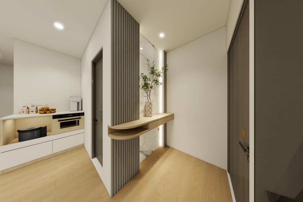 入門玄關運用格柵與大理石牆面,融合自然紋理與現代材質,營造開放舒適的迎賓氛圍,一進門便讓人放鬆愉悅。懸空設計不僅減少清潔死角,還避免孩子意外碰撞,提升空間的視覺輕盈感,帶來便捷維護與優雅氛圍。和室設計結合傳統美感與現代功能,提供舒適居住感與高效收納,無論是家人共聚或靜心休憩,都是全家人的最愛角落。